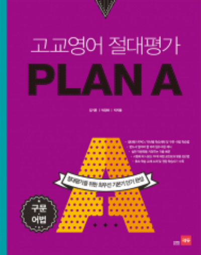 고교영어 절대평가 PLAN A는 절대평가 시대에 가장 기본적이고 최우선시되는 영어의 기본 핵심을 분야별(구문·어법, 독해, 어휘) 3권 시리즈로 담고 있다. 구문 어법편에는 빈출 구문 핵심포인트 16개와 빈출 어법 포인트 10개를 중심으로 정확하고 빠른 학습을 위한 특급 노하우를 소개한다. 또, 앞으로의 영어 공부를 위한 “절대평가 로드맵”을 통해 효율적인 학습계획까지 세울 수 있도록 완벽하게 구성했다.