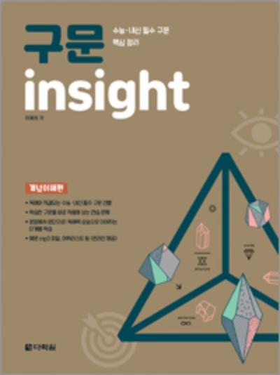 구문 insight 시리즈는 독해와 직결되는 수능과 내신 필수 구문을 통해 독해 실력을 키울 수 있게 도와주는 구문 학습서입니다. 수능 내신 대비 필수 개념 기본서인 ‘insight’ 시리즈에서 새로 선보이는 본 교재는 ‘구문 insight 개념이해편’, ‘구문 insight 독해‧영작 응용편’ 두 권으로 이루어져 있으며 ‘개념이해편’으로 수능‧내신 필수 구문에 대한 전반적인 학습 및 훈련을 하고, ‘독해‧영작 응용편’으로 수능형 지문에 제시된 구문을 문맥을 통해 집중적으로 훈련하며 실전에 효율적으로 대비하도록 했습니다.