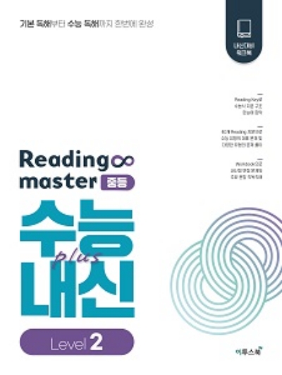 Reading Master 수능 Plus 내신은 기본 독해부터 수능 독해까지 한번에 잡는 중등 독해서입니다. Reading Key로 수능식 지문 구조 한눈에 파악할 수 있습니다. 40개 Reading 지문으로 수능 유형의 대표 문제 및 다양한 유형의 문제 풀이를 제공합니다. Workbook으로 내신형 변형 문제와 주요 문장 직독직해를 제공합니다.