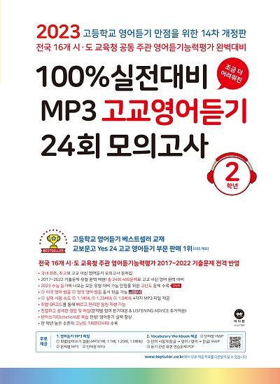듣기부문 최강교재입니다. 교보문고, Yes 24 고교 영어듣기 부문 판매 1위 (EBS 제외) 입니다. 전국 16개 시·도 교육청 주관 영어듣기능력평가 기출문제 전격 반영합니다. 실제 시험과 동일한 속도, 1.1배, 1.25배, 1.5배 빠른 속도의 4가지 MP3 파일 제공합니다. 회별 QR코드를 통해 빠르고 편리한 음원 재생 가능합니다.
