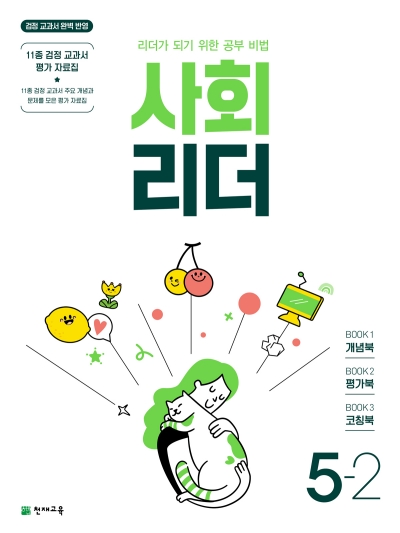 사회 리더는 개념북, 평가북, 코칭북으로 나뉩니다. 사회 공부를 하는데는 많은 시간을 투자하기 보다는 좋은 책 한권을 골라서 공부를 하면되는데 천재교육의 교재로 공부를 하면 도움이 될것입니다.