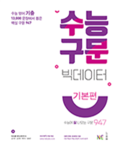 수능에 나오는 구문을 빅데이터로 모아서 꼭 필요한 부분을 공부할 수 있습니다. 실제 수능 구문에 나오는 문장으로 공부를 하면 그 안에서 문법과 어휘 등을 한번에 공부할 수 있습니다. 빅데이터로 분석한 수능 구문을 공부하세요. 이 자료의 저작권은 해당 출판사에 있습니다. 이 사이트에서는 단순하게 정답 답지만을 제공합니다.
