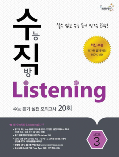 수능 리스닝을 꼼꼼하게 공부할 수 있습니다. 맞춤형 MP3를 제공함으로써 스스로 공부할 수 있습니다. 수능 대비용으로 적합하며 모의고사 20회로 실전과 가까운 환경에서 공부해볼 수 있습니다.
