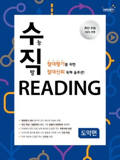 수능직방 Reading은 수능 대비 영어 교재이다. 평가원 문제를 반영하여 핵심 기출문제를 구성했다. 직독직해 해설을 바탕으로 독해력 능력을 향상시키고, 난이도별 정리를 통해 시간 효율을 극대화시킨 학습이 가능하다.