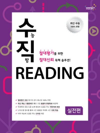 수능직방 Reading은 수능 대비 영어 교재이다. 평가원 문제를 반영하여 핵심 기출문제를 구성했다. 직독직해 해설을 바탕으로 독해력 능력을 향상시키고, 난이도별 정리를 통해 시간 효율을 극대화시킨 학습이 가능하다.