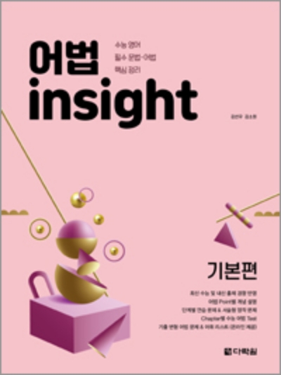 어법 insight는 10년 간 수능에 출제된 어법 문제의 어법 포인트를 분석하여 학습자들이 문법 개념 및 수능 어법 문제에 쉽게 다가갈 수 있도록 구성한 수능 영어 교재입니다. 수능에 반복 출제되는 어법 Point 27개를 선별하여 각 Point 별 어법 사항의 개념을 설명하고, 설명한 개념의 이해를 묻는 적절한 예문들과 문제를 수록하였습니다. 또한 명확하고 자세한 해설과 더불어 학습에 필요한 어휘 리스트, 기출 변형 문제 등 다양한 부가 자료를 홈페이지에서 무료로 제공함으로써 학습자의 자기주도적 학습을 가능하게 하는 최고의 수능 대비서입니다.