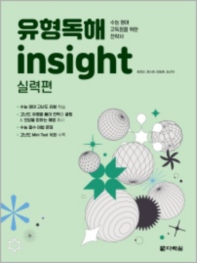 유형독해 insight 실력편은 수능 영어의 고난도 유형을 집중 훈련하여, 전략적으로 고득점을 달성할 수 있도록 구성한 교재입니다. 고난도 유형별 풀이 전략과 꿀팁으로 오답을 피하는 해법을 제시해 주고, 수능 필수 어법 문제와 고난도 Mini Test를 통해 수능 영어 1등급을 완성할 수 있습니다.