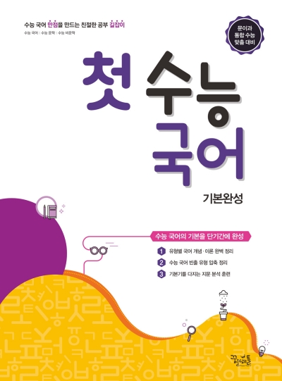 첫 수능국어 기본완성은 쉽고 빠르게 국어의 기본을 완성하는 수능 길잡이입니다. 단기간에 국어의 기본을 다질 수 있는 최적의 구성합니다. 수능에 익숙해질 수 있도록 수능 빈출 유형 압축 정리합니다. 출제 가능성이 높은 지문과 문제를 통해 실전 감각 키울 수 있습니다. 최근 출제 경향에 따른 갈래 복합 제재&고난도 긴 지문 훈련합니다. 독해력과 작품 감상 능력을 기를 수 있도록 지문 분석을 위한 학습 장치 배치합니다.