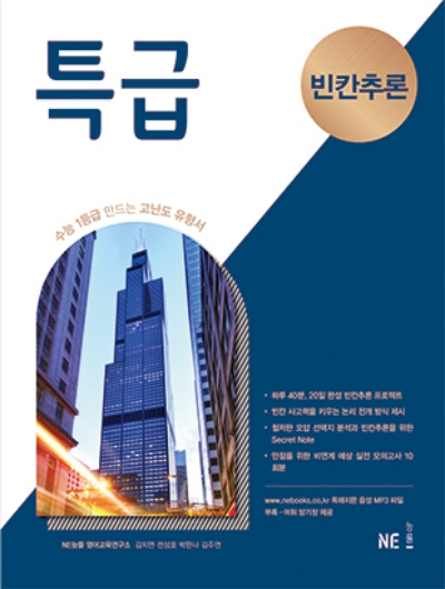 하루 40분, 20일 완성 빈칸추론 프로젝트를 제공합니다. 빈칸 사고력을 키우는 논리 전개 방식 제시합니다. 철저한 오답 선택지 분석과 빈칸추론을 위한 Secret Note를 제공합니다. 만점을 위한 비연계 예상 실전 모의고사 10회분 수록하였습니다. 본문에 나온 중요 어휘들을 휴대용 어휘 암기장으로 제공합니다.