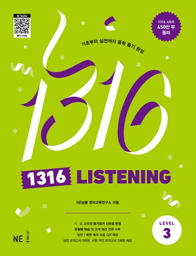 1316 Listening은 기초부터 실전까지 중학 영어 듣기를 완성 시킬 수 있는 교재입니다. 1316 시리즈는 리딩, 리스닝, 그래머 모두 제공합니다. 기초를 다지면서 영어를 잘 듣고 이해할 수 있게 만들어줍니다.
