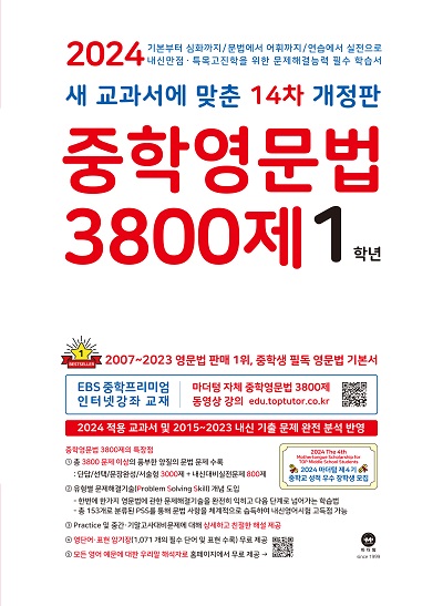 중학영문법 3800제는 꾸준하게 매년 나오는 교재입니다. 2024년 적용 교과서에 맞추어서 14차 개정판을 출시하였습니다. 최신 개정 교과서 및 최신 기출 문제 완전 분석을 통하여 반영하였습니다. 이 자료의 저작권은 해당 출판사에 있습니다. 이 사이트에서는 단순하게 정답 답지만을 제공합니다.