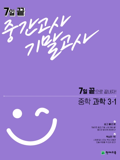중학교 내신 대비 완성교재로는 7일 끝 시리즈가 있습니다. 초단기 시험 대비를 하기 위해서 만들어져서 시험에 꼭 나오는 핵심만 콕콕 찝어서 알려줍니다. 학습량은 줄이고 효율은 높여 7일 안에 중간, 기말고사를 최적화해서 대비할수 있습니다. 확실한 기초 다지기를 통해서 꼭 필요한 핵심 개념을 이해할수 있고 다양한 기출 예상문제를 통해서 학교 시험 문제 등의 다양한 문제를 수록하고 철저한 시험 대비를 합니다.
