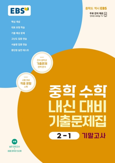 EBS 중학 수학 내신 대비 기출문제집은 실제 시험과 동일한 형식으로 구성한 3회분의 모의고사를 제공합니다. 시험 직전 최종 실력 점검을 위한 50문제를 제공합니다. 이 자료의 저작권은 해당 출판사에 있습니다. 이 사이트에서는 단순하게 정답 답지만을 제공합니다.