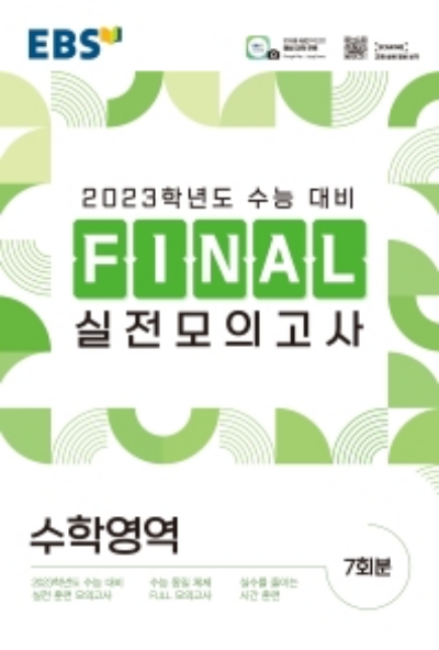EBS의 첫 번째 모의고사 시리즈 FINAL 실전모의고사입니다. 최다 과목, 최다 분량입니다. 수능과 동일한 난이도의 신규 모의고사 7회분을 제공합니다. 가장 많은 수험생이 선택한 EBS 대표 모의고사입니다. 수능과 동일한 체제의 모의고사로 실전 감각 업그레이드하였습니다. 2023학년도 수능 대비 가장 먼저 출시되는 모의고사로 6월 모의평가부터 대비할 수 있습니다.